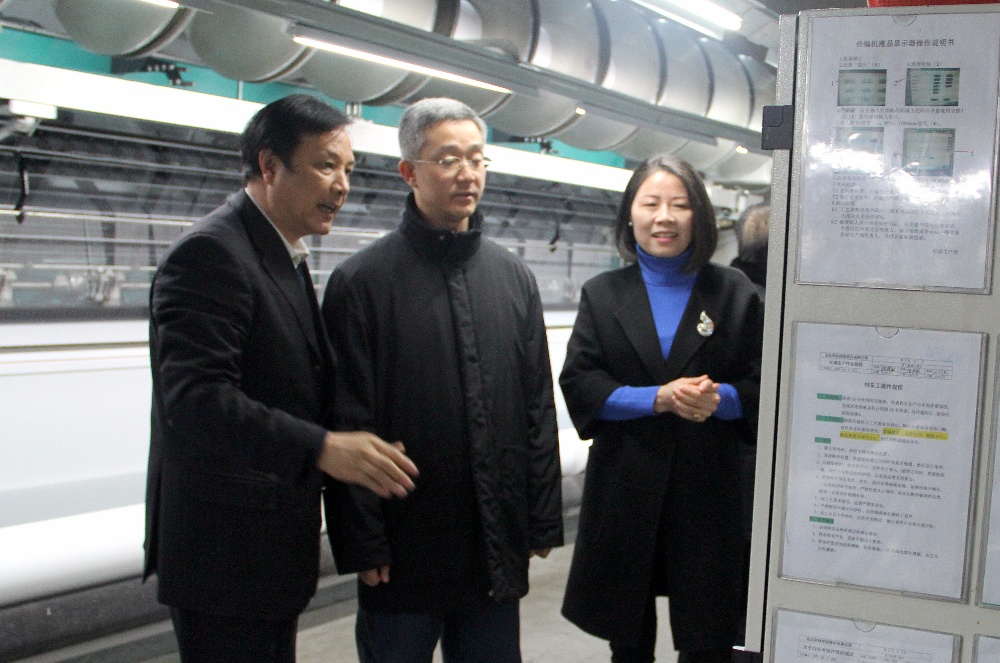 The former vice president of the Party Committee of the Zhejiang Provincial Party Committee and the then secretary of the CPC Haining Municipal Party Committee, Fang Genrong (second from right), took photos with the director Shen Guofan after the guidance of the Xucun warp knitting factory.