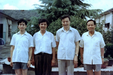 The former vice president of the Party Committee of the Zhejiang Provincial Party Committee and the then secretary of the CPC Haining Municipal Party Committee, Fang Genrong (second from right), took photos with the director Shen Guofan after the guidance of the Xucun warp knitting factory.