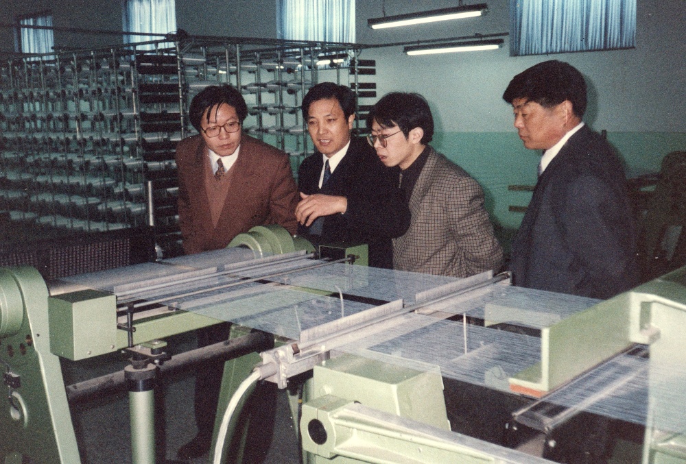 時任海寧市市長應(yīng)忠良(左)在浙江宏達(dá)經(jīng)編實業(yè)公司車間