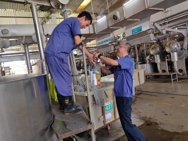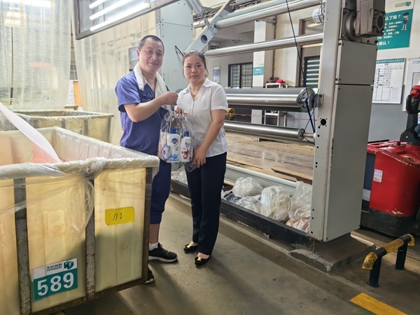 在“宏達高科”溫度最高的染整定型、染整染色車間,公司管理人員向堅守崗位的一線員工表示親切的慰問和感謝,為他們送上毛巾、沐浴露等清涼用品,囑咐大家高溫生產不忘安全,做到勞逸結合,并要求各部門切實做好防暑降溫工作,保障員工健康安全。