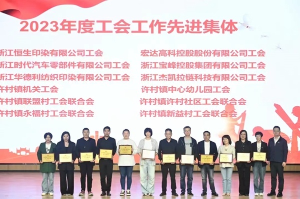 會議宣讀了關于2023年度先進集體、優秀工會工作者、2024年最美職工、工人先鋒號的公布文件。隨后,受到表彰的先進集體和個人依次上臺領獎。“宏達高科”工會獲評“2023年度工會先進集體”,周美玲同志獲評“2023年度優秀工會工作者”,曹燕麗同志獲評“2024年度最美職工”,公司汽車用紡織品檢測中心獲評“許村鎮工人先鋒號”。