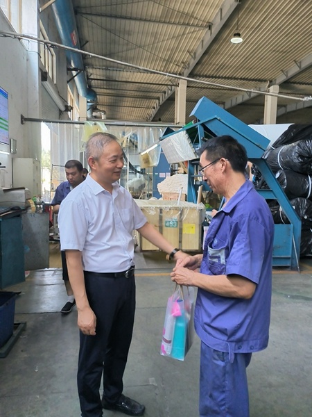 在“宏達高科”生產車間,工人們正揮汗如雨,緊張有序地進行著定型、染色等工序。許建舟總經理一行帶著防暑降溫物資,親手將裝著沐浴露、冰紅茶、毛巾等物品的“防暑降溫大禮包”遞到員工手中,并向他們送上了誠摯問候與深切敬意。