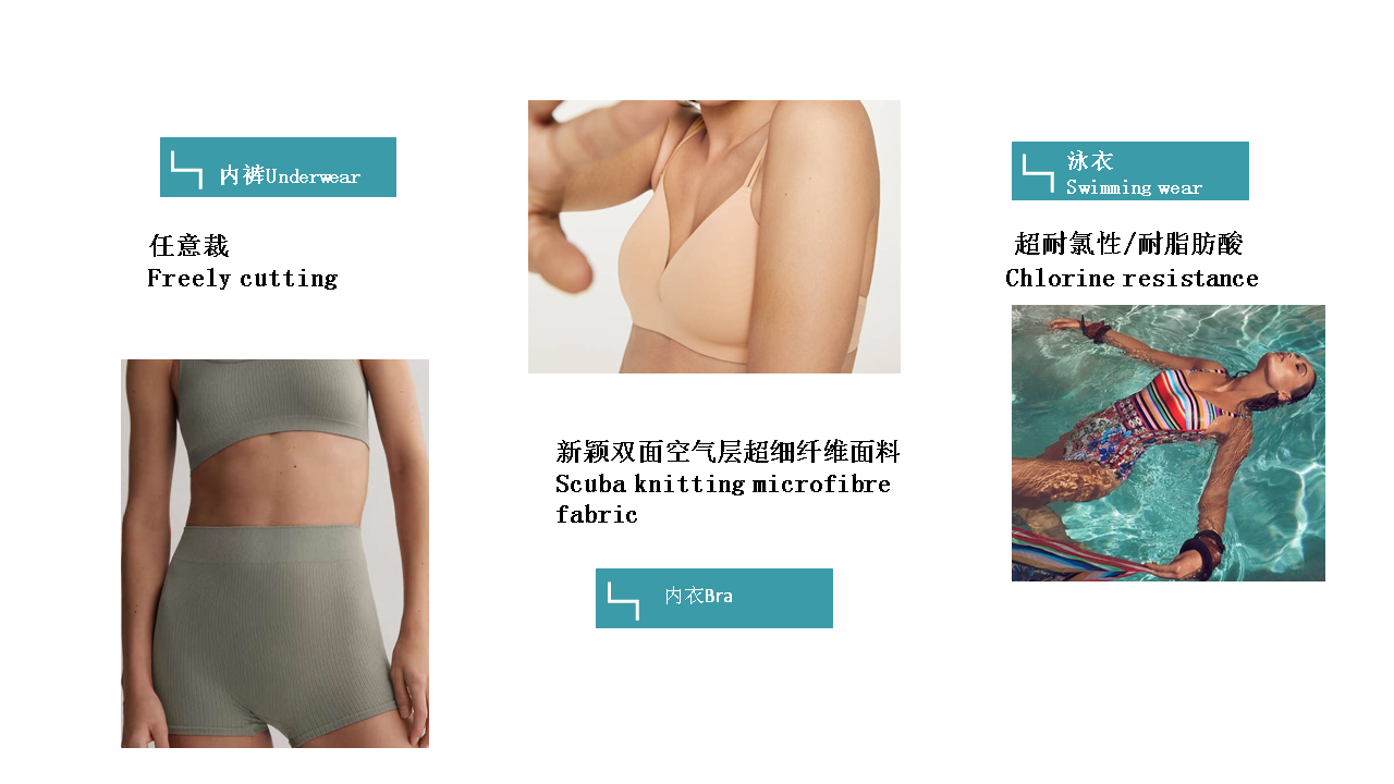 公司創造性的應用進口生產設備,精心采購國際優質原材料和染 化料,所生產的彈性和尼龍面料制作各種泳衣、潛水服、內衣、 文胸、睡衣的理想面料,具有穿著舒適,觸感輕柔、恢復性好易 吸汗、不產生靜電等優點,系列產品被評為“浙江省高質量科技 產品”。生產的網眼、起絨類經編面料,更是運動衣、體操衣、 滑雪衣、球類衣等的上乘面料之選。目前,公司生產的系列面料 已通過Oeko-Tex Standard 100生態紡織品認證,品質達到 國際先進水平,批量配套阿迪達斯等世界著名品牌,遠銷歐美。
